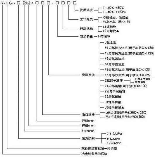 Y-HG1系列冶金設備用液壓缸為雙作用活塞缸,缸徑一般在40~320mm范圍內,工作壓力<=16MPA,其基本參數(shù),包括缸徑、桿徑、行程、油口尺寸。