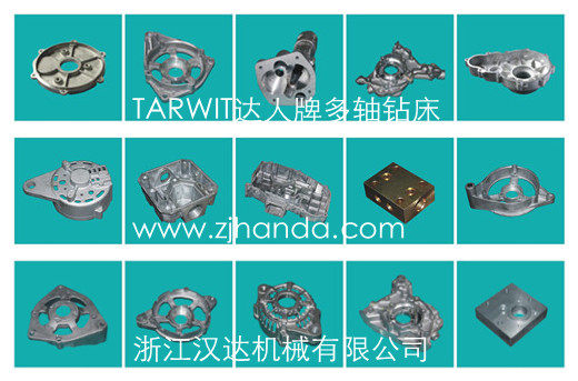 該產(chǎn)品可廣泛應(yīng)用于機(jī)械行業(yè)多孔零部件的鉆孔及攻絲加工,如汽車、摩托車多孔零部件、發(fā)動(dòng)機(jī)箱體、鋁鑄件殼體、制動(dòng)鼓、剎車盤、轉(zhuǎn)向器、輪轂、差速殼、軸頭、半軸等,泵類、閥類、液壓元件、太陽(yáng)能配件等等。比如以下工件: