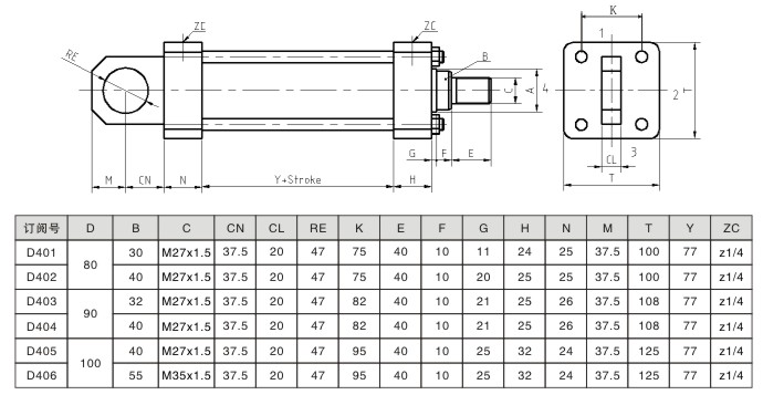 以下為后耳環(huán)安裝的低壓拉桿液壓缸的尺寸圖及參數(shù)。